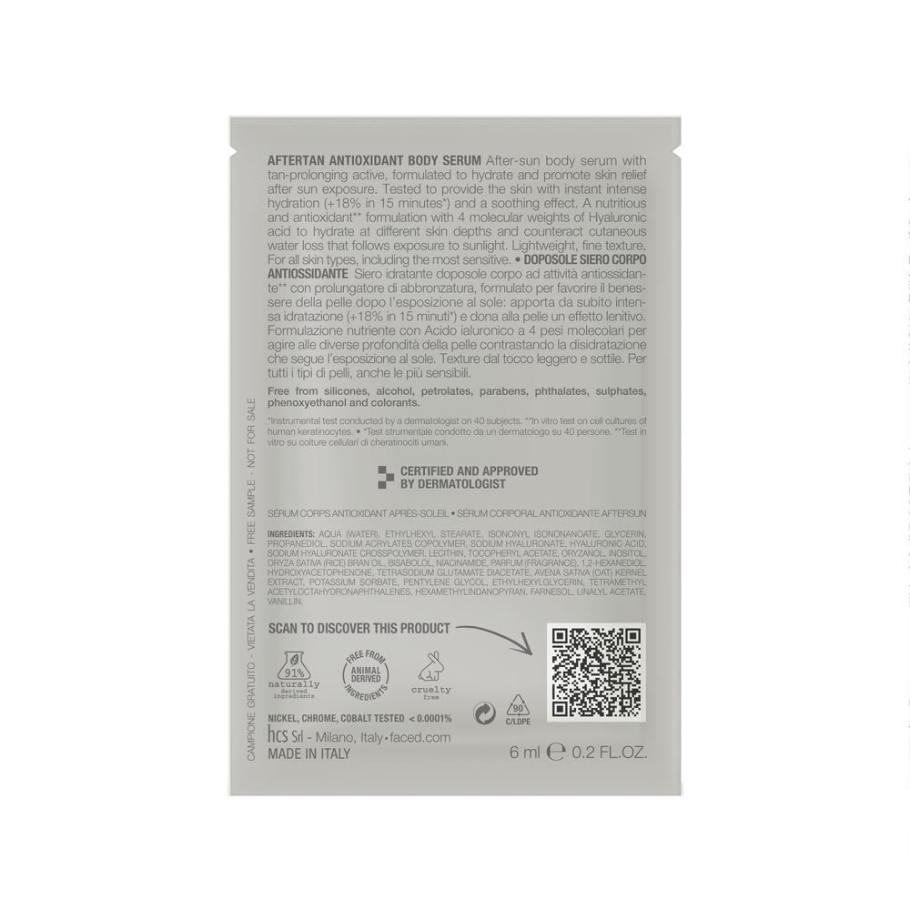 Siero dopo-abbronzatura innovativo ad attività antiossidante con prolungatore di abbronzatura, formulato per ripristinare il tasso d’idratazione dopo l’esposizione al sole.